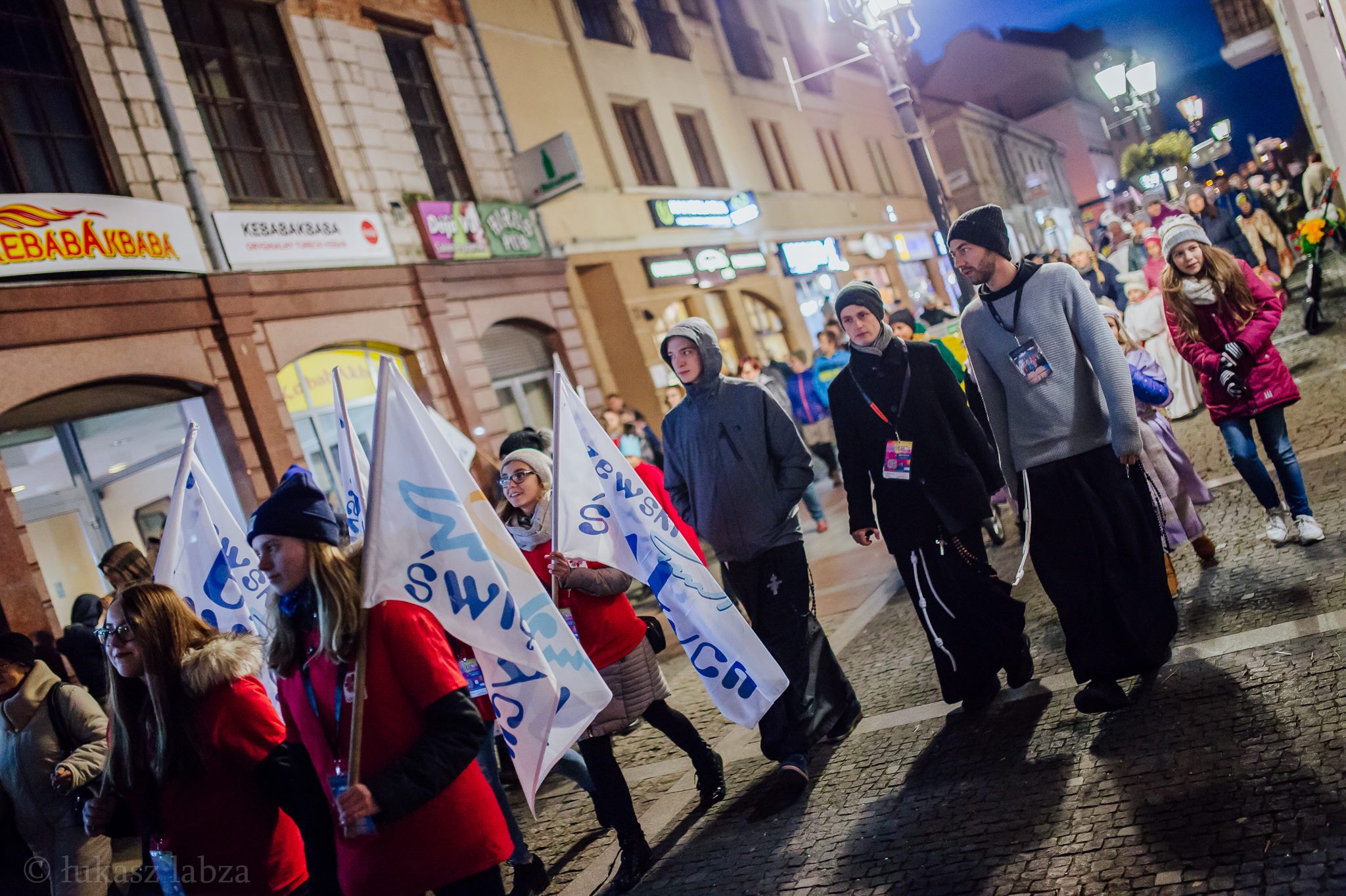 Szczerze mówiąc, to nie jestem pewny, czy w radosnym orszaku, który wyruszył we wtorek wieczorem, 31. października spod dworca w Tczewie, znajdowały się tytułowe trzy święte cytrzystki. Natomiast zobaczyć było można ludzi odzianych w skrzydła, aureole. Był anioł w białym garniturze z gęstą ciemną brodą, kilku biskupów, kilku prawdziwych księży, co najmniej jedna siostra zakonna (i pewnie też przebrane). W tym wesołym tłumie byliśmy także my. Tak rozpoczął się V Tczewski Bal Świętych, na który zaproszono także nasz zespół. Przemarsz upłynął w radosnej atmosferze, wśród śpiewów i okrzyków. W miarę jak zbliżał się do centrum miasta, uczestników przybywało. Na rynku czekała scena, pojawiły się relikwie z okolicznych kościołów. Zagrano poloneza, potem były też inne tańce, prowadzone przez wodzireja z grupą taneczną; wolontariusze z Caritas odegrali pantomimę. Zgłodniali mogli się pokrzepić darmową zupą z dyni i zapiekankami. W tzw. „strefie świętości” spowiadali kapłanami.