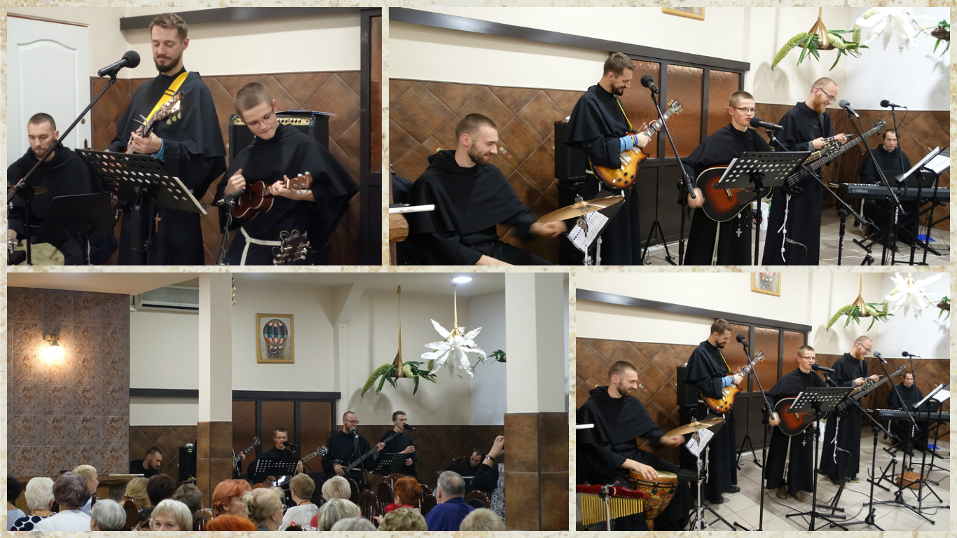 Po krótkiej modlitwie podzieliliśmy się opłatkiem i zjedliśmy „wigilijny” posiłek. Pod koniec wieczerzy przystąpiliśmy do wykonania naszej głównej misji. Seniorzy, choć na początku nieśmiało, to z każdą chwilą coraz śmielej dołączali się do kolędowania, do czego w sposób żywiołowy a niepozbawiony uroku zachęcał br. Wiktor. Podobnie jak w klubie abstynenckim, na koniec zagraliśmy pastorałki Arki Noego, których wykonanie spotkało się z bardzo dobrym przyjęciem, tak samo jak wieńczące nasz pobyt Błogosławieństwo św. Franciszka. Łzy wzruszenia pojawiły się w oczach naszych gospodarzy, a potem, nieoczekiwanie, jedna z pań, białym, ludowym śpiewem, poczęstowała nas uroczą przyśpiewką świąteczną, improwizując ostatnią zwrotkę na temat naszego pobytu. Byliśmy zachwyceni!