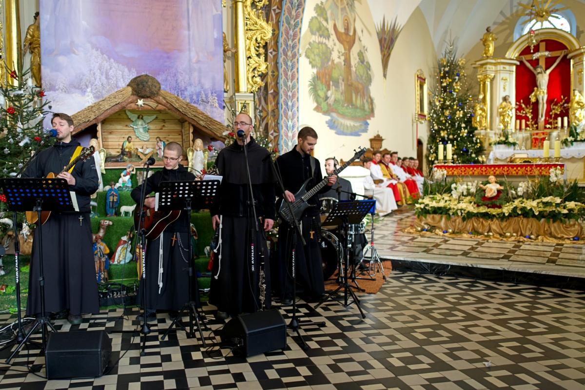 Całą niedzielę śpiewem kolęd ubogacaliśmy liturgię mszy świętych. Po każdej z nich zagraliśmy także kilka kolęd (a także piosenki z naszej najnowszej płyty) dołączając sekcję rytmiczną (perkusja i gitara basowa), której unikamy podczas Mszy. Parafianie chętnie włączali się w śpiew znanych kolęd w naszych, często bardziej skocznych, aranżacjach.